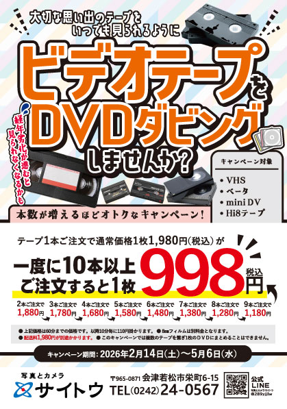 【受付店舗】写真とカメラ サイトウ TEL:0242-24-0567